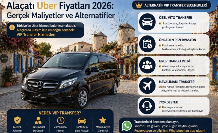 Alaçatı Uber fiyatları 2026 için araştırılamaz çünkü Türkiye’de hizmet yoktur. Uber 2020’de Türkiye pazarından çekilmiştir. Ancak alternatif VIP transfer fiyatları çok avantajlıdır. Alaçatı Uber Alternatifi VIP Transfer sayfasından güncel fiyatları öğrenebilirsiniz. Şeffaf ve sabit fiyat garantisi sunulmaktadır.