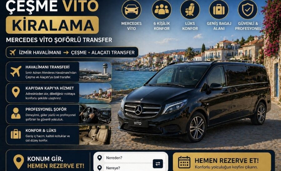 Çeşme Vito kiralama hizmeti ile konforlu ve güvenli yolculuk yapabilirsiniz. Mercedes Vito lüks araçlarla profesyonel transfer sağlanır. Alaçatı transfer ve İzmir havalimanı Çeşme ulaşım için idealdir. Çeşme Vito Rezervasyon Rehberi sayfasından detaylı bilgi