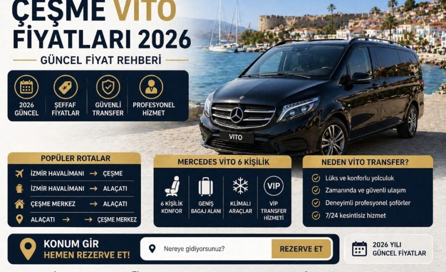 Çeşme Vito fiyatları 2026 yılı için şeffaf ve sabit tutulmaktadır. Mesafe bazlı net hesaplama yapılır online sistemle. Alaçatı transfer ve İzmir havalimanı Çeşme ulaşım uygun fiyatlıdır. Çeşme Vito Rezervasyon Rehberi sayfasından tüm detayları